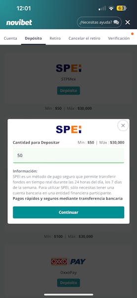 - Elige un método de pago y realiza tu primer depósito. En mi caso, deposité $50 MXN.