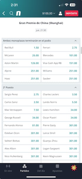 El primer paso fue seleccionar un deporte entre las 38 opciones disponibles en Novibet. En mi caso fue la Fórmula 1, específicamente en el próximo evento en puerta, el Gran Premio de China.